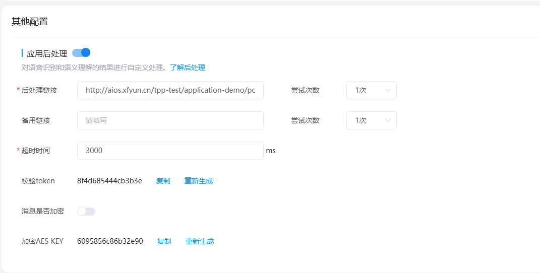 <div style="max-width: 100%; margin: 20px auto;"> <!-- 便签卡片容器 --> <div style="background-color: #ffffff; border-radius: 8px; box-shadow: 0 2px 8px rgba(0,0,0,0.1); overflow: hidden; font-family: 'Comic Sans MS', cursive, sans-serif;"> <!-- 便签头部 --> <div style="background-color: #F4F8FA; padding: 1px 10px; border-bottom: 1px solid #dee2e6; display: flex; justify-content: space-between; align-items: center;"> <div style="color: #0E42D2; font-weight: bold;font-size: 1.3rem;">应用后处理配置概述</div> <div> </div> </div> <!-- 带横线的内容区域 --> <div style="padding: 25px; line-height: 27px; background-image: linear-gradient(transparent 26px, #dee2e6 27px, #dee2e6 27px, transparent 27px); background-size: 100% 28px; min-height: 100px; color: #333;"> <div>该配置项,是AIUI服务链路提供开发者做云端结果接受处理的服务通道,不区分AIUI应用类型,配置方式都是一样的。其中包括:</div> <div style="margin-left: 20px; margin-top: 5px;font-size: 0.95rem;"><strong>-配置说明:</strong></div> <div style="margin-left: 40px; margin-top: 5px;"> <a href="#后处理链接" style="color: #6f42c1; font-weight: 500;"> <strong>- 1、后处理链接>>>点击跳转</strong></a> </div> <div style="margin-left: 40px;"> <a href="#重试次数和超时时间" style="color: #6f42c1; font-weight: 500;"> <strong>- 2、重试次数和超时时间>>>点击跳转</strong></a> </div> <div style="margin-left: 20px; margin-top: 5px;font-size: 0.95rem;"><strong>-协议说明:</strong></div> <div style="margin-left: 40px;"> <a href="#服务器验证-GET" style="color: #6f42c1; font-weight: 500;"> <strong>- 1、服务器验证-GET>>>点击跳转</strong></a> </div> <div style="margin-left: 40px;"> <a href="#接收消息-POST" style="color: #6f42c1; font-weight: 500;"> <strong>- 2、接收消息-POST>>>点击跳转</strong></a> </div> <div style="margin-left: 40px;"> <a href="#接入指引" style="color: #6f42c1; font-weight: 500;"> <strong>- 3、接入指引>>>点击跳转</strong></a> </div> <div></div> </div> <!-- 便签底部 --> </div> </div> </div> ## 1. 配置说明 应用后处理提供能力开关项,操作能力配置时,AIUI平台会主动发起一次GET校验请求。 内容配置主要分4大块 - 云服务和备用地址填写 - 超时或出错尝试次数 - 服务请求超时时间限制 - 消息是否加密开关  <div id="后处理链接"> </div> ### 1.1. 后处理链接 这里配置开发者自己的云服务地址,开发者可通过该地址在对话交互中接受服务转发结果,关于服务地址基础要求有: - 支持公网访问 - 推荐域名方式配置 - 服务支持POST和GET请求【详见第2节协议配置说明】 <div id="重试次数和超时时间"> </div> ### 1.2. 重试次数和超时时间 交互链路中AIUI做服务转发,可以配置异常重试次数。重试次数和超时时间之间有信息关联。 请求超时最大时长是依赖尝试次数来决定的,即 **最大时长 * 尝试次数 ≤ 9000ms** ## 2. 协议说明 AIUI 后处理能够根据识别、语义结果,提供个性化的服务。 <div id="服务器验证-GET"> </div> ### 2.1. 服务器验证-GET 1. 提交信息后,AIUI发送GET请求到开发者服务器URL,请求参数如下: <table border="0" class="docutils" style="width: 100%;"> <colgroup> <col width="15%" /> <col width="50%" /> </colgroup> <tbody valign="top"> <tr class="row-odd"> <td><b>参数</b></td> <td><b>描述</b></td> </tr> <tr class="row-even"> <td>signature</td> <td>加密签名,signature结合了开发者填写的token参数和请求中的timestamp参数、rand参数。</td> </tr> <tr class="row-even"> <td>timestamp</td> <td>时间戳</td> </tr> <tr class="row-even"> <td>rand</td> <td>随机数</td> </tr> </tbody> </table> 2. 开发者校验signature(下面有校验方式),返回开放平台中token值的sha1加密内容,则接入成功。 <div style="display: flex; gap: 5px; max-width: 100%; margin: 5px auto; flex-wrap: wrap;"> <!-- 左侧卡片 --> <div style="flex: 1; min-width: 300px; padding: 15px 15px 0px; background-color: #; border-radius: 8px; box-shadow: inset 0 1px 2px rgba(0,0,0,0.15), 0 1px 1px rgba(255,255,255,0.1);"> <p style="color: #666; line-height: 2;font-size: 1rem;"><strong>👤加密/校验流程</strong> <br>- 将token、timestamp、rand三个参数值进行字典序排序 <br>- 将三个参数字符串拼接成一个字符串进行sha1加密 <br>- 开发者获得加密后的字符串可与signature对比,标识该请求来源于AIUI服务 </div> <!-- 右侧卡片 --> <div style="flex: 1; min-width: 300px; padding: 15px 15px 0px; background-color: #; border-radius: 8px; box-shadow: inset 0 1px 2px rgba(0,0,0,0.15), 0 1px 1px rgba(255,255,255,0.1);"> <p style="color: #666; line-height: 1.6;font-size: 1rem;"><strong>🔍响应消息:</strong> </p> <p style="color: #666; line-height: 2;font-size: 1rem;">- 将token进行sha1加密,放在响应的body中返回</p></div> </div> <div style="display: flex; align-items: center; background-color: #fff3cd; border-left: 6px solid #ffc107; border-radius: 4px; padding: 12px 16px; gap: 8px;"> <div style="width: 30px; height: 30px; flex-shrink: 0;"> <svg viewBox="0 0 24 24" fill="none" stroke="currentColor" stroke-width="2" stroke-linecap="round" stroke-linejoin="round"> <path d="M12 9v2m0 4h.01m-6.938 4h13.856c1.54 0 2.502-1.667 1.732-3L13.732 4c-.77-1.333-2.694-1.333-3.464 0L3.34 16c-.77 1.333.192 3 1.732 3z"/> </svg> </div> <div style="flex: 1; line-height: 1.6;"> <h3 style="margin: 0 0 6px 0; font-weight: 600;">注意:</h3> <p style="margin: 0; font-size: 0.95rem;">校验流程是可选操作,但消息返回必须正确才能校验成功</p> </div> </div> 示例: ``` java Map<String, String[]> parameterMap = request.getParameterMap(); String rand = parameterMap.get("rand")[0]; String timestamp = parameterMap.get("timestamp")[0]; String signature = parameterMap.get("signature")[0]; // 字典序排序 ArrayList<Stri