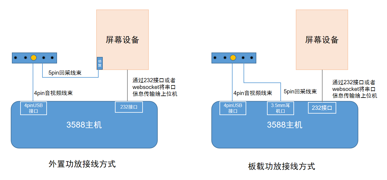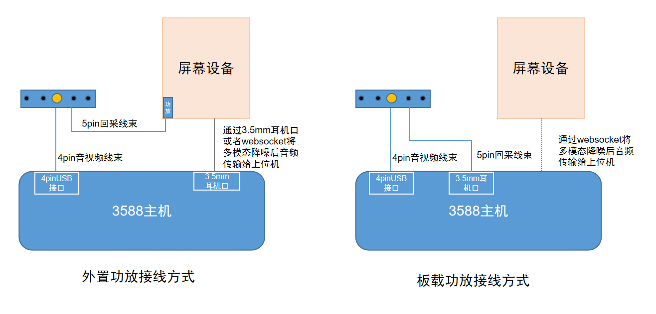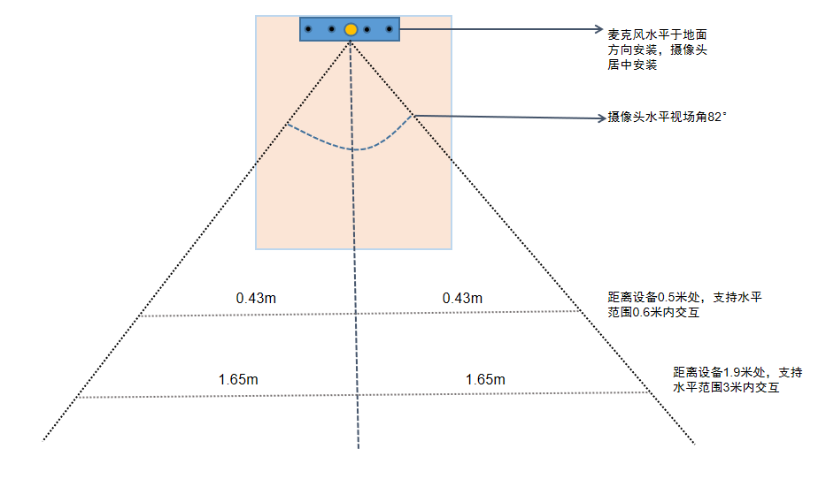 # **目 录** 1. 产品概述 2. 产品清单 3. 交互距离说明 4. 产品功能与原理 5. 典型应用场景 6. 多模态应用版本更新说明 7. 硬件接口说明 8. 系统接线与工作模式 9. 硬件尺寸信息 10. 主机规格参数 11. 组装注意事项 12. 技术服务与支持 # 离线资料下载 RK3588s 极简多模态套件开发资料(产品白皮书、使用手册),可以点击下载: [【附件】RK3588s 极简多模态套件开发资料.zip](/media/attachment/2026/01/RK3588s_%E6%9E%81%E7%AE%80%E5%A4%9A%E6%A8%A1%E6%80%81%E5%A5%97%E4%BB%B6%E5%BC%80%E5%8F%91%E8%B5%84%E6%96%99.zip) # 1. 产品概述 通用多模态交互开发套件采用RK3588S高性能、低功耗的八核应用处理器,搭载Android 13.0系统,主频高达2.4GHz。嵌入式3D GPU使RK3588S与OpenGL ES 1.1/2.0/3.2、OpenCL 2.2和Vulkan 1.2完全兼容。集成了LVDS、EDP、MIPI、千兆以太网、wifi、蓝牙,4G接口,5G接口,5W*2功放、TF卡扩展、红外遥控、串口/IO扩展、HDMI输出、MIC、背光供电等功能,显著降低了整机系统的设计与集成复杂度。 本套件是集成了免唤醒词人脸唤醒、多模态降噪与大模型交互于一体的软硬件一体化产品,旨在彻底解决复杂环境下的语音交互难题,广泛应用到AI服务器、人脸支付设备、安防、医疗、交通、金融、工控、智慧教育、智能零售等等AI智能领域。 # 2. 产品清单 <table border="0" class="docutils" style="width: 100%;"> <colgroup> <col width="5%" /> <col width="10%" /> <col width="5%" /> <col width="30%" /> </colgroup> <tbody valign="top"> <tr> <td align="center" valign="center"><b>序号</b></td> <td align="center" valign="center"><b>硬件名称</b></td> <td align="center" valign="center"><b>数量</b></td> <td align="center" valign="center"><b>说明</b></td> </tr> <tr> <td valign="center">1</td> <td valign="center">3588s主板</td> <td valign="center">1</td> <td valign="center">默认无外壳,选配带外壳主机</td> </tr> <tr class="row-even"> <td valign="center">2</td> <td valign="center">500W摄像头</td> <td valign="center">1</td> <td valign="center" rowspan="2">摄像头焦距3.3mm,支持0.5米到1.9米内交互<br>默认裸件,选配带结构件外壳</td> </tr> <tr> <td valign="center">3</td> <td valign="center">声卡麦板二合一板</td> <td valign="center">1</td> </tr> <tr> <td valign="center">4</td> <td valign="center">电源适配器</td> <td valign="center">1</td> <td valign="center">长度1.5米,航嘉电源适配器</td> </tr> <tr> <td valign="center">5</td> <td valign="center">USB线束</td> <td valign="center">1</td> <td valign="center">长度2.5米,4pinUSB2.0转4pinUSB2.0线束</td> </tr> <tr> <td valign="center">6</td> <td valign="center">摄像头线束</td> <td valign="center">1</td> <td valign="center">长度5.6cm,4pinUSB2.0转4pinUSB2.0线束</td> </tr> <tr> <td valign="center">7</td> <td valign="center">回采线</td> <td valign="center">1</td> <td valign="center">长度2.5米,5pin转3.5mm耳机口</td> </tr> <tr> <td valign="center">8</td> <td valign="center">串口线</td> <td valign="center">1</td> <td valign="center">主板:1米,4pin ttl接口转USB串口线<br>主机:1米,4pin 232接口转USB串口线</td> </tr> <tr> <td valign="center">9</td> <td valign="center">天线</td> <td valign="center">1</td> <td valign="center">主板:12cm天线<br>主机:12cm胶棒天线</td> </tr> </tbody> </table> <center>表1 产品清单列表</center>  <center>图1 3588s主板(默认配置)</center>  <center>图2 3588s带外壳主机(可选配)</center>  <center>图3 单目500摄像头(远近场融合)</center>  <center>图4 声卡麦板二合一板</center>  <center>图5 线束实物图</center> # 3. 交互距离说明 - 摄像头面向人脸,线性四麦麦克风板拾音孔面向正前方安装。 - 适用于距离屏幕0.5米~1.9米交互距离内使用。  <center>图6 水平方向交互距离说明</center>  <center>图7 垂直视场角场景说明</center> - 摄像头倾斜角度说明:表内角度基于摄像头65°垂直视场角,并以确保1.3米至1.9米身高用户的人脸能清晰落入画面中央为原则计算得出,仅供参考,实际安装时可微调。 <table border="0" class="docutils" style="width: 100%;"> <colgroup> <col width="10%" /> <col width="10%" /> <col width="10%" /> <col width="10%" /> <col width="10%" /> </colgroup> <tbody valign="top"> <tr> <td align="center" valign="center"><b>摄像头安装高度</b></td> <td align="center" valign="center"><b>推荐交互距离</b></td> <td align="center" valign="center"><b>摄像头建议上下倾斜角度</b></td> <td align="center" valign="center"><b>最低身高</b></td> <td align="center" valign="center"><b>最高身高</b></td> </tr> <tr> <td valign="center">1.2</td> <td valign="center">0.6m</td> <td valign="center">向上倾斜20°</td> <td valign="center">1.3m</td> <td valign="center">2.07m</td> </tr> <tr> <td valign="center">1.3</td> <td valign="center">0.6m</td> <td valign="center">向上倾斜15°</td> <td valign="center">1.31m</td> <td valign="center">1.95m</td> </tr> <tr> <td valign="center">1.4</td> <td valign="center">0.6m</td> <td valign="center">向上倾斜10°</td> <td valign="center">1.35m</td> <td valign="center">1.95m</td> </tr> <tr> <td valign="center">1.5</td> <td valign="center">0.6m</td> <td valign="center">向下倾斜5°</td> <td valign="center">1.38m</td> <td valign="center">1.96m</td> </tr> <tr> <td valign="center">1.6</td> <td valign="center">0.6m</td> <td valign="center">不倾斜</td> <td valign="center">1.41m</td> <td valign="center">1.98m</td> </tr> <tr> <td valign="center">1.7</td> <td valign="center">1m</td> <td valign="center">不倾斜</td> <td valign="center">1.33m</td> <td valign="center">2.33m</td> </tr> <tr> <td valign="center">1.8</td> <td valign="center">1m</td> <td valign="center">不倾斜</td> <td valign="center">1.43m</td> <td valign="center">2.43m</td> </tr> <tr> <td valign="center">1.9</td> <td vali