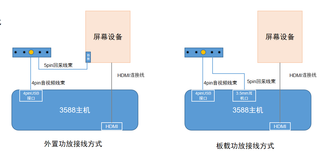 # **目 录** 1. 产品概述 2. 产品组合速览 2.1. 组合矩阵 2.2. 组合选择指引 3. 语音主控 3.1. 产品清单 3.1.1. AIUI通用多模态主板(标配) 3.1.2. AIUI通用多模态主机(选配) 3.2. 主控规格 3.3. 接口规格 3.3.1. AIUI通用多模态主板接口实物图 3.3.2. AIUI通用多模态主机接口实物图 3.4. 尺寸信息 3.4.1. AIUI通用多模态主板尺寸信息 3.4.2. AIUI通用多模态主机尺寸信息 3.5. 电气性能(裸板) 3.6. 材料要求 4. 拾音模块 4.1. 产品清单 4.1.1. 四麦单目声卡三合一配件(标配) 4.1.2. 四麦单目声卡三合一结构件(选配) 4.2. 接口规格 4.2.1. 四麦单目声卡三合一配件接口规格 4.2.2. 四麦单目声卡三合一结构件接口规格 4.3. 尺寸信息 4.3.1. 四麦单目声卡三合一配件尺寸图 4.3.2. 四麦单目声卡三合一结构件尺寸图 4.4. 配套线束尺寸信息 5. 组装注意事项 5.1. 四麦单目声卡三合一配件安装要求 5.2. 四麦单目声卡三合一结构件安装要求 6. 交互范围说明 7. 系统接线与工作模式 7.1. 作为AI工控机主机模式 7.2. 作为输出语音交互指令从机模式 7.3. 作为输出多模态降噪音频从机模式 8. 产品功能点 9. 多模态应用版本更新说明 10. 技术服务与支持 10.1. 开发资料 10.2. 保修与售后 # 离线资料下载 RK3588S 多模态套件开发资料(产品白皮书、使用手册、规格书),可以点击下载: [【附件】RK3588S通用多模态套件开发资料.zip](/media/attachment/2026/03/RK3588S%E9%80%9A%E7%94%A8%E5%A4%9A%E6%A8%A1%E6%80%81%E5%A5%97%E4%BB%B6%E5%BC%80%E5%8F%91%E8%B5%84%E6%96%99.zip) # 1. 产品概述 RK3588S通用多模态开发套件采用RK3588S高性能、低功耗的八核应用处理器,搭载Android 13.0系统,主频高达2.4GHz。嵌入式3D GPU使RK3588S与OpenGL ES 1.1/2.0/3.2、OpenCL 2.2和Vulkan 1.2完全兼容。集成了LVDS、EDP、MIPI、千兆以太网、wifi、蓝牙,4G接口,5G接口,10W功放、TF卡扩展、红外遥控、串口/IO扩展、HDMI输出、背光供电等功能,显著降低了整机系统的设计与集成复杂度。 本套件是集成了免唤醒词人脸唤醒、多模态降噪与大模型交互于一体的软硬件一体化产品,硬件上由语音主控和拾音模块两部分组成,旨在彻底解决复杂环境下的语音交互难题,广泛应用到AI服务器、人脸支付设备、安防、医疗、交通、金融、工控、智慧教育、智能零售等等AI智能领域。 # 2. 产品组合速览 ## 2.1 组合矩阵 <table border="0" class="docutils" style="width: 100%;"> <colgroup> <col width="15%" /> <col width="15%" /> <col width="15%" /> <col width="15%" /> </colgroup> <tbody valign="top"> <tr> <td align="center" valign="center"><b>组合名称</b></td> <td align="center" valign="center"><b>主控模块</b></td> <td align="center" valign="center"><b>拾音模块</b></td> <td align="center" valign="center"><b>适用场景</b></td> </tr> <tr> <td valign="center">基础开发组合(主推)</td> <td valign="center">AIUI通用多模态主板(标配)</td> <td valign="center">四麦单目声卡三合一配件(标配)</td> <td valign="center">设备内部集成,开发调试,最灵活</td> </tr> <tr> <td valign="center">快速验证组合</td> <td valign="center">AIUI通用多模态主板(标配)</td> <td valign="center">四麦单目声卡三合一结构件(选配)</td> <td valign="center">快速原型验证,减少开发工作量</td> </tr> <tr> <td valign="center">工业部署组合</td> <td valign="center">AIUI通用多模态主机(选配)</td> <td valign="center">四麦单目声卡三合一配件(标配)</td> <td valign="center">外置主机 + 内部拾音,适合改造现有设备</td> </tr> <tr> <td valign="center">整机交付组合</td> <td valign="center">AIUI通用多模态主机(选配)</td> <td valign="center">四麦单目声卡三合一结构件(选配)</td> <td valign="center">整机交付,快速部署,即插即用</td> </tr> </tbody> </table> <center>表1 产品组合矩阵表</center> ## 2.2 组合选择指引 * 如果需要**嵌入自有设备**,选基础开发组合(主板+配件)。 * 如果需要**快速验证功能**,不想处理麦克风结构,选快速验证组合(主板+结构件)。 * 如果需要**外置主机**,但拾音部分嵌入设备,选工业部署组合(主机+配件)。 * 如果需要**整机外置**,不想做任何结构设计,选整机交付组合(主机+结构件)。 # 3. 语音主控 ## 3.1. 产品清单 ### 3.1.1. AIUI通用多模态主板(标配) 特点:主板尺寸小巧,适合集成到设备内部,占用空间少。 内容:AIUI通用多模态主板+电源适配器+ttl串口线+天线。  <center>图1 AIUI通用多模态主板实物图</center> ### 3.1.2. AIUI通用多模态主机(选配) 特点:主板集成到金属外壳内部,有一定防尘防水作用,适合外置使用。 内容:AIUI通用多模态主机+电源适配器+232串口线+天线棒。  <center>图2 AIUI通用多模态主机实物图</center> ## 3.2. 主控规格 <table border="0" class="docutils" style="width: 100%;"> <colgroup> <col width="5%" /> <col width="5%" /> </colgroup> <tbody valign="top"> <tr> <td align="center" valign="center" colspan="2">主要硬件参数</td> </tr> <tr> <td>CPU</td> <td>八核(四核Cortex-A76,四核Cortex-A55)64位,主频最高2.4GHz</td> </tr> <tr> <td>GPU</td> <td>ARM Mali G610 3D GPU, 支持OpenGL ES 1.1/2.0/3.2、OpenCL 2.2、Vulkan 1.2</td> </tr> <tr> <td>NPU</td> <td>RKNN NPU,算力最大至 6 TOPS</td> </tr> <tr> <td>内存</td> <td>默认8G,4G/8G/16G(可选)</td> </tr> <tr> <td>内置存储器</td> <td>默认64G,32G /64G/128G/256G(可选)</td> </tr> <tr> <td>显示</td> <td>支持EDP/HDMI 2.1/MIPI/LVDS/DP(TYPE-C )</td> </tr> <tr> <td>系统</td> <td>Android 13</td> </tr> <tr> <td>播放模式</td> <td>支持循环、定时、插播等多种播放模式</td> </tr> <tr> <td>多媒体</td> <td>支持MPEG-1,MPEG-2,MPEG-4,H.263,H.264,H.265,VC-1,VP9,VP8,MVC