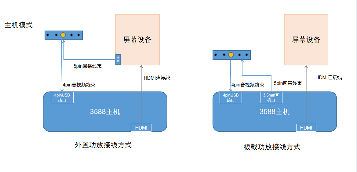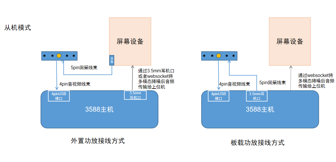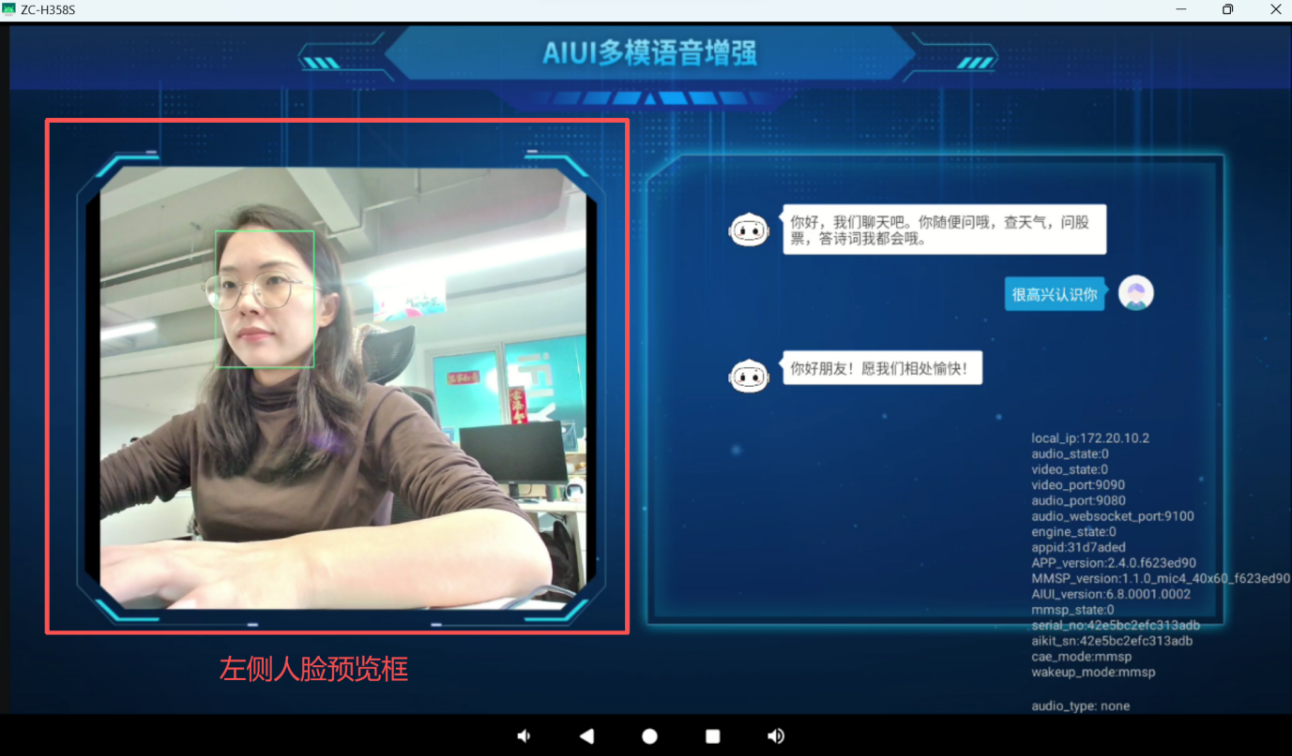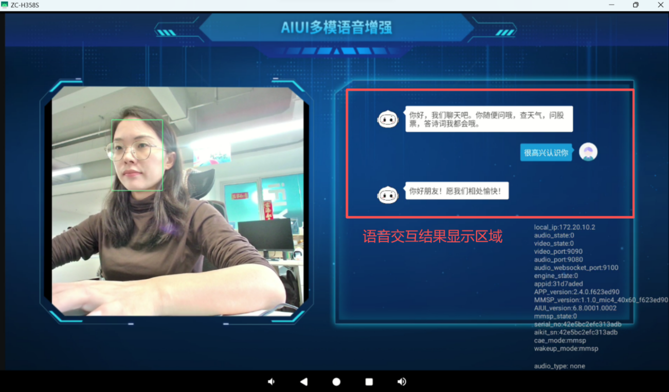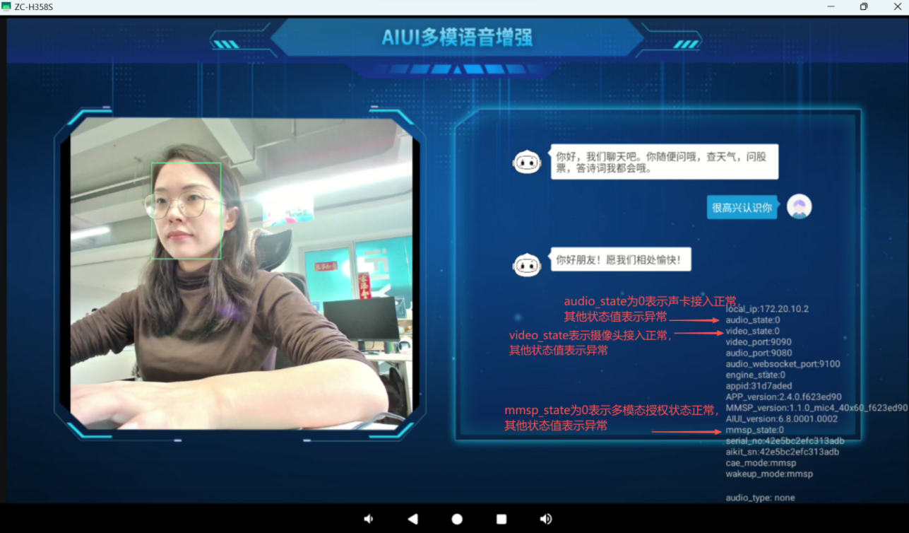 # 目录 1. 产品概述 1.1编写目的 1.2 技术简介 1.3 主要应用场景 1.4 套件清单 2. 硬件介绍与安装 2.1硬件实物图 2.2 麦克风实物检查 2.3 接线实物图 3. 体验准备与说明 3.1 开机与系统初始化 3.2 配置网络 4. 功能详解 4.1 可视化交互界面说明 4.2 标准使用模式 4.3 扩展使用方式说明 5. 高级配置与开发 5.1 Appid申请与配置 5.2 协议对接 5.3 二次开发指南 6. 调试与故障排除 6.1日志获取与分析 6.2获取本地音频、图像 6.3常见问题汇总 7. 附录 # 离线资料下载 RK3588s 极简多模态套件开发资料(产品白皮书、使用手册),可以点击下载: [【附件】RK3588s 极简多模态套件开发资料.zip](/media/attachment/2026/01/RK3588s_%E6%9E%81%E7%AE%80%E5%A4%9A%E6%A8%A1%E6%80%81%E5%A5%97%E4%BB%B6%E5%BC%80%E5%8F%91%E8%B5%84%E6%96%99.zip) ## 1. 产品概述 ## 1.1 编写目的 本文档主要为了让客户快速接入极简通用多模态套件。 ## 1.2 技术简介 多模态降噪技术通过融合视觉与声学信息实现高效降噪,其工作原理是:系统通过检测人脸打开唤醒状态,将唇形跟语音信息作为起始和结束信号来控制拾音过程;在锁定主讲人后,系统分析唇动信息处理高噪声环境下的音频,再将优化后的音频上传至云端进行识别。这一技术方案能够有效提升高噪环境中的语音交互准确性和鲁棒性。 ## 1.3 主要应用场景 - **智慧政务一体机:**提供免接触、高效率的业务查询与办理体验。 - **医疗自助挂号机:**通过人脸与语音交互,简化就诊流程,保护患者隐私。 - **交通枢纽购票机:**在嘈杂环境中精准识别用户指令,快速完成票务购买。 - **商业虚拟人交互大屏:**主动吸引顾客注意,实现精准营销与互动导览。 - **工业调度大屏:**解放双手,通过语音指令实时查询与操控生产信息。 ## 1.4 套件清单 <table border="0" class="docutils" style="width: 100%;"> <colgroup> <col width="5%" /> <col width="10%" /> <col width="5%" /> <col width="30%" /> </colgroup> <tbody valign="top"> <tr> <td align="center" valign="center"><b>序号</b></td> <td align="center" valign="center"><b>硬件名称</b></td> <td align="center" valign="center"><b>数量</b></td> <td align="center" valign="center"><b>说明</b></td> </tr> <tr> <td valign="center">1</td> <td valign="center">3588s主板</td> <td valign="center">1</td> <td valign="center">默认无外壳,选配带外壳主机</td> </tr> <tr class="row-even"> <td valign="center">2</td> <td valign="center">500W摄像头</td> <td valign="center">1</td> <td valign="center" rowspan="2">摄像头焦距3.3mm,支持0.5米到1.9米内交互<br>默认裸件,选配带结构件外壳</td> </tr> <tr> <td valign="center">3</td> <td valign="center">声卡麦板二合一板</td> <td valign="center">1</td> </tr> <tr> <td valign="center">4</td> <td valign="center">电源适配器</td> <td valign="center">1</td> <td valign="center">长度1.5米,航嘉电源适配器</td> </tr> <tr> <td valign="center">5</td> <td valign="center">USB线束</td> <td valign="center">1</td> <td valign="center">长度2.5米,4pinUSB2.0转4pinUSB2.0线束</td> </tr> <tr> <td valign="center">6</td> <td valign="center">摄像头线束</td> <td valign="center">1</td> <td valign="center">长度5.6cm,4pinUSB2.0转4pinUSB2.0线束</td> </tr> <tr> <td valign="center">7</td> <td valign="center">回采线</td> <td valign="center">1</td> <td valign="center">长度2.5米,5pin转3.5mm耳机口</td> </tr> <tr> <td valign="center">8</td> <td valign="center">串口线</td> <td valign="center">1</td> <td valign="center">主板:1米,4pin ttl接口转USB串口线<br>主机:1米,4pin 232接口转USB串口线</td> </tr> <tr> <td valign="center">9</td> <td valign="center">天线</td> <td valign="center">1</td> <td valign="center">主板:12cm天线<br>主机:12cm胶棒天线</td> </tr> </tbody> </table> <center>表1 通用多模态套件清单</center> # 2.硬件介绍与安装 ## 2.1 硬件实物图  <center>图1 通用多模态四麦单目远焦配件硬件内容图</center> ## 2.2 麦克风实物检查  <center>图2 麦克风正面图</center> - 若麦克风有密封贴请撕下所有密封贴,确保麦克风板孔如上图无遮挡。 - 麦克风正面朝向人收音。 ## 2.3 接线实物图  <center>图3 通用多模态套件裸板实物接线图</center> 1. 为保障Wi-Fi连接质量,请先插上天线; 2. 使用4pin转4pin音视频线束连接四麦声卡板和3588s主板,获取音视频信号; 3. 使用4pin转3.5mm耳机口线束,一端连接声卡板的‘回采接口’,另一端连接3588s主板的3.5mm耳机输出口,用于采集设备自身播放的音频以实现回声消除;(如使用外置功放,回采从外置功放接回四麦声卡板); 4. 使用HDMI线束连接3588s主板跟显示屏,连接无线网络及体验多模态demo; 5. 插上电源; 6. 正式组装时,最好将摄像头放在麦克风板中间的孔洞中,保障最佳使用效果。 7. **注意:请确保在断电情况下进行连接操作。**  <center>图4 通用多模态套件带外壳反面接线图</center>  <center>图5 通用多模态套件带外壳正面接线图</center> 可按照图示顺序接线。 # 3.体验准备与说明 ## 3.1开机与系统初始化 **准备条件:** 需要可连接HDMI的显示器 - 连接主板的HDMI接口以及显示的HDMI接口。  <center>图6 hdmi接线图</center> - 接上电源等待设备启动完成,启动完成后如下图。  <center>图7 3588s系统launcher图</center> - 接入鼠标或使用触屏 “**向上滑动**”,进入系统应用界面。  <center>图8 3588s应用界面图</center> ## 3.2 配置网络 - **wifi模式:** 点击界面中的 设置----网络与互联网----互联网----选择wifi输入密码连接wifi - **有线网络模式:** 直接将网线插入到3588s主板的网口中 ## 3.3 启动多模态应用 - 点击应用界面的《多模态应用》