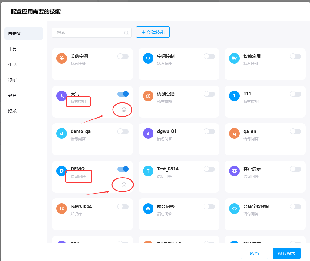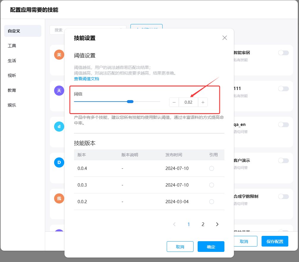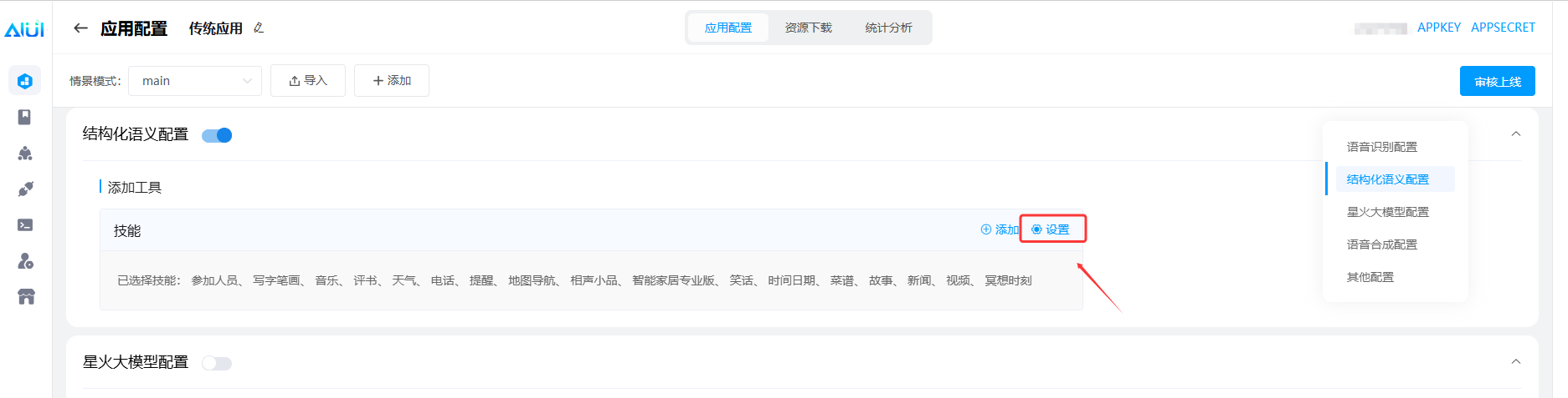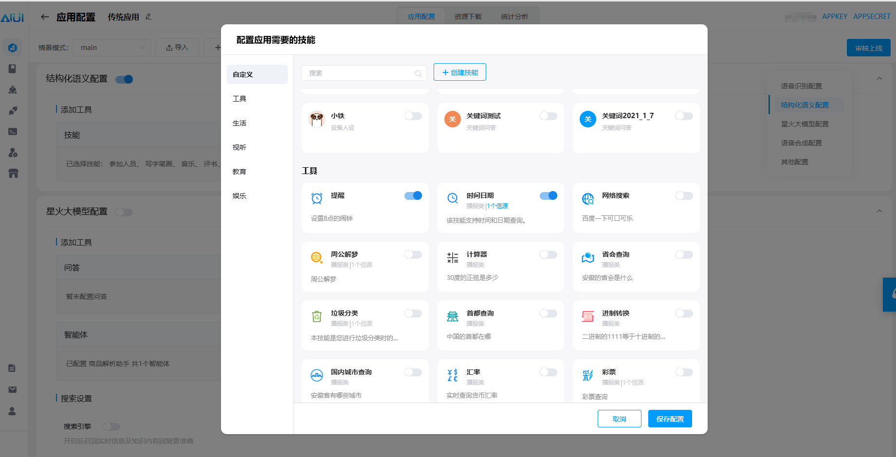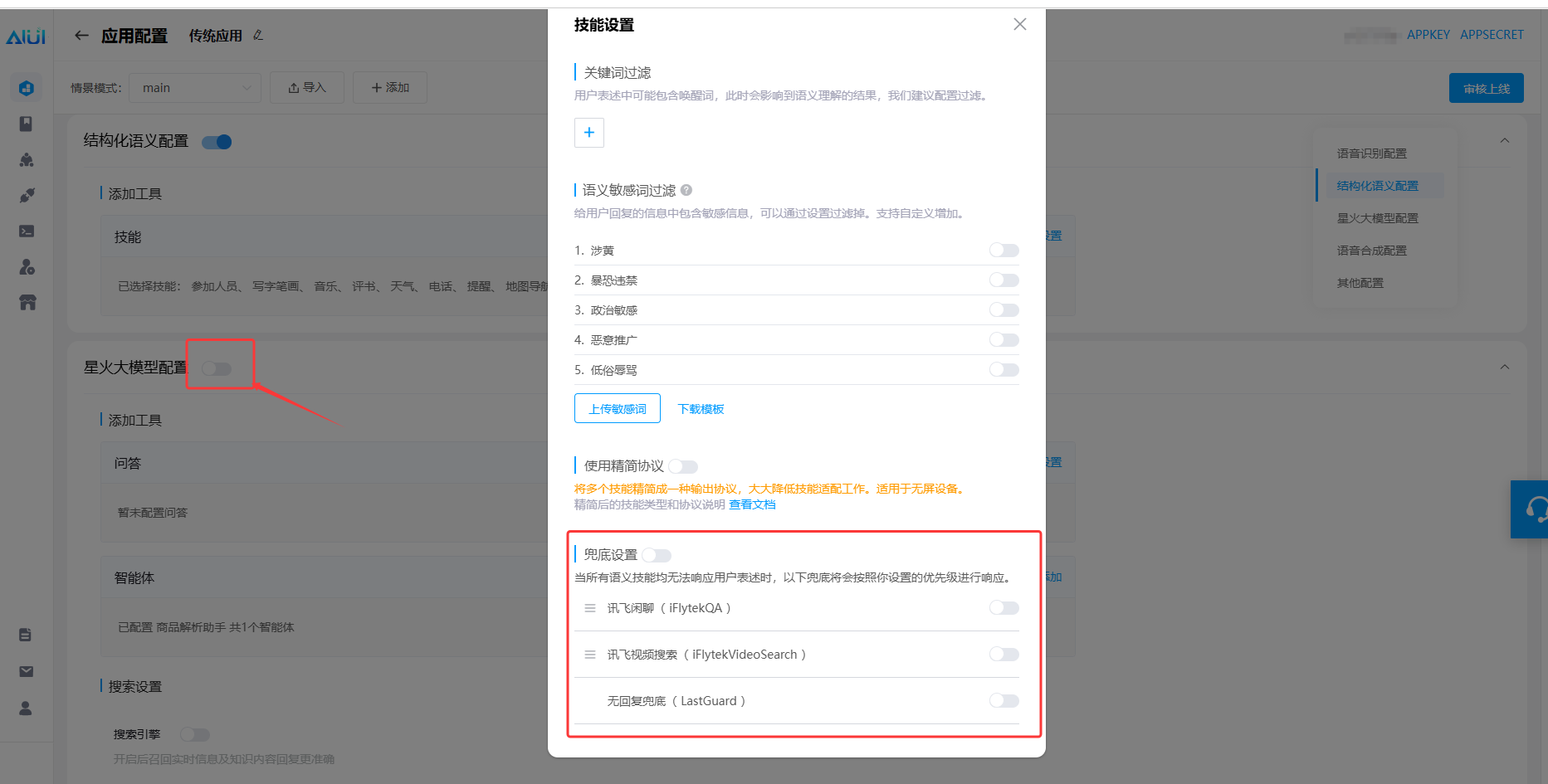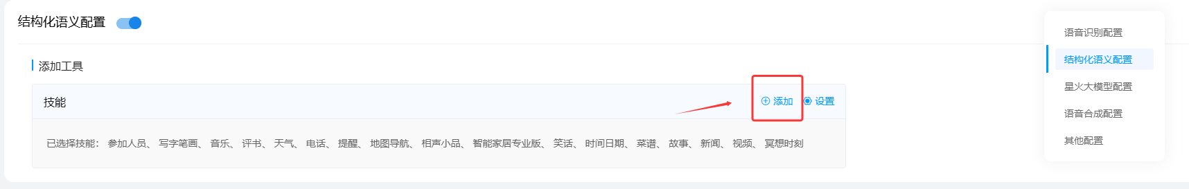 <div style="max-width: 100%; margin: 20px auto;"> <!-- 便签卡片容器 --> <div style="background-color: #ffffff; border-radius: 8px; box-shadow: 0 2px 8px rgba(0,0,0,0.1); overflow: hidden; font-family: 'Comic Sans MS', cursive, sans-serif;"> <!-- 便签头部 --> <div style="background-color: #F4F8FA; padding: 1px 10px; border-bottom: 1px solid #dee2e6; display: flex; justify-content: space-between; align-items: center;"> <div style="color: #0E42D2; font-weight: bold;font-size: 1.3rem;">结构化语义配置概述</div> <div> </div> </div> <!-- 带横线的内容区域 --> <div style="padding: 25px; line-height: 29px; background-image: linear-gradient(transparent 26px, #dee2e6 27px, #dee2e6 27px, transparent 27px); background-size: 100% 28px; min-height: 100px; color: #333;"> <div>结构化语义配置是传统应用配置技能的地方,支持配置的技能类型有:官方技能、自定义技能、语句问答、关键词问答、设备人设(注意区分这里的设备和极速链路回复角色区别,二者不是一个能力。前者是传统语义技能方式,后者是大模型prompt设置);并且还支持进行特性设置,如自定义技能或自定义语句问答的阈值设置、关键词过滤、语义敏感词、精简协议。其中包括:</div> <div style="margin-left: 20px; margin-top: 10px;"> <a href="#技能配置" style="color: #6f42c1; font-weight: 500;"> <strong>- 1、技能配置>>>点击跳转</strong></a> </div> <div style="margin-left: 20px;"> <a href="#自定义技能阈值设置" style="color: #6f42c1; font-weight: 500;"> <strong>- 2、自定义技能阈值设置>>>点击跳转</strong></a> </div> <div style="margin-left: 20px;"> <a href="#技能设置" style="color: #6f42c1; font-weight: 500;"> <strong>- 3、技能设置>>>点击跳转</strong></a> </div> <div></div> </div> <!-- 便签底部 --> </div> </div> </div> <div id="技能配置"> </div> ## 1. 技能配置 点击“添加”,可在当前应用的情景模式下配置需要的技能。   <div id="自定义技能阈值设置"> </div> ## 2. 自定义技能阈值设置 在自定义技能添加界面,勾选自定义技能后,点击技能下的设置图标进行设置,注意支持的技能类型: **自定义私有技能、自定义语句问答** 自定义阈值主要是为了做技能匹配度调节的,可以根据实际需要(模糊匹配度和误识别两个维度)综合考虑设置。 AIUI技能实际触发的模糊匹配程度,可以查看技能json中的source字段取值,可以参考该取值进行自定义技能阈值调整。 - 技能阈值越高:技能对出发的语句格式要求越严(模糊匹配越低,不容易误识别) - 技能阈值越低:技能对出发的语句格式要求越送(模糊匹配越高,容易误识别)   <div id="技能设置"> </div> ## 3. 技能设置 技能配置后,还可以点击“设置”进行一些高级能力配置,开发者按需设置。 - **关键词过滤** 过滤识别结果中的关键词,不进行语义理解。常用于过滤唤醒词 比如:唤醒词是“小飞小飞” **过滤前**:“小飞小飞,你好“ **过滤后**:“你好“ - **语义敏感词过滤** 给用户回复的信息中包含敏感信息,可以通过设置过滤掉。支持自定义增加。 注意: 当交互回复触发语义敏感词过滤时,固定响应: ```json { answer: { text: "文明社会,请文明用语。", topic: "", type: "T" }, operation: "ANSWER", rc: 0, service: "forbidden", sid: "xxxxxxxxx", state: null, text: "xxx", uuid: "xxxxxxxxx" } ``` - **精简协议** 简化结构化语义,将技能结果分为:媒资类和播报类。默认关闭。 将多个技能精简成一种输出协议,大大降低技能适配工作。适用于无屏设备。  <figure style="text-align: center;"> <img src="/media/202508/2025-08-12_194246_5856210.3540283832065939.png" alt="示例图片" /> <figcaption></figcaption> </figure> 注意当AIUI应用不开启**星火大模型配置**时,点击技能设置,还可以配置传统语义链路下的兜底闲聊。开启大模型时,可以由大模型做兜底回复,该能力被替代隐藏。 分别支持的类型有: - 讯飞闲聊 - 讯飞视频搜索 - 无回复兜底 该能力项下,开发者可以自定义回复语
