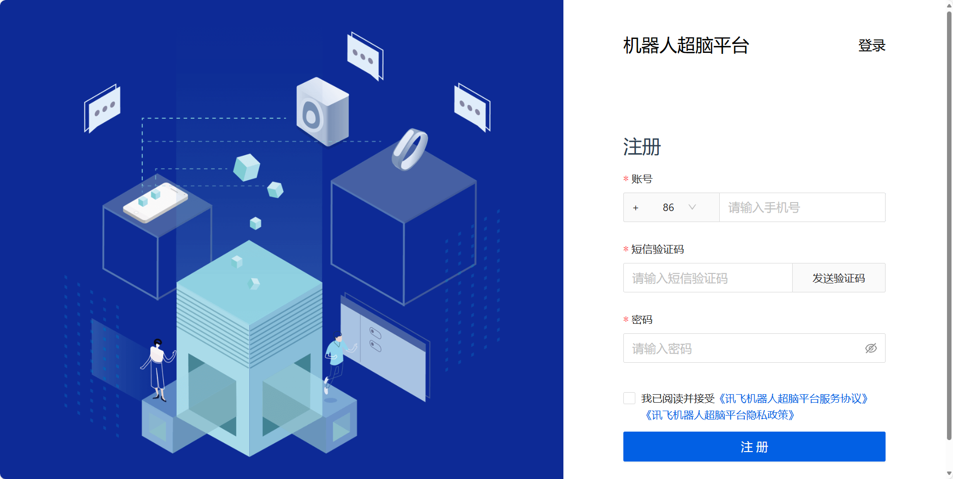 [讯飞机器人超脑平台](http://aibot.xfyun.cn)与[讯飞开放平台](http://www.xfyun.cn) 和[AIUI开放平台](http://aiui.xfyun.cn)共用一套账号体系,已有这两个平台账号的可直接登录。 ## 注册账号 1. 在讯飞机器人超脑平台登陆页面,右上角点击 “注册”,进入账号注册界面。   2. 进入账号注册界面(登陆页支持,点注册跳转到注册页面),填写相关信息,此处用户名只支持手机号。 阅读《讯飞机器人平台服务协议》和《讯飞机器人平台隐私政策》后,勾选“我已阅读并接受”,点击”注册“,即可完成账号注册。 ## 账号登陆 您成功注册讯飞机器人超脑平台账号后,可以在超脑平台网站登录,从而使用您需要的产品和服务。 1. 进入讯飞机器人超脑平台登陆页面,右上角点击 “登录”,进入账号登陆界面  2. 输入注册的账号和密码,点击登录按钮,完成登录。 3. 登陆成功后,跳转机器人超脑平台首页  ## 用户认证 注册成功之后,首次登陆机器人超脑平台,申请用户资格认证可以给予您更多的平台使用权限和保障(可选择跳过,未认证的用户功能会受限)。 用户资格认证相关说明见:https://www.xfyun.cn/doc/authentication/authentication.html